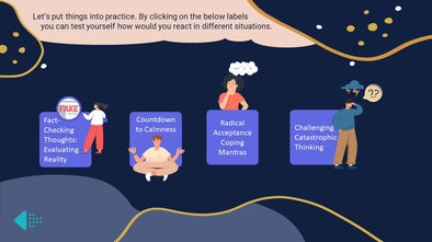 This activity helps learners internalize the concept of distinguishing between catastrophic thinking and reality in everyday situations. It's a self-paced, interactive exercise that engages learners in critical thinking and self-reflection.